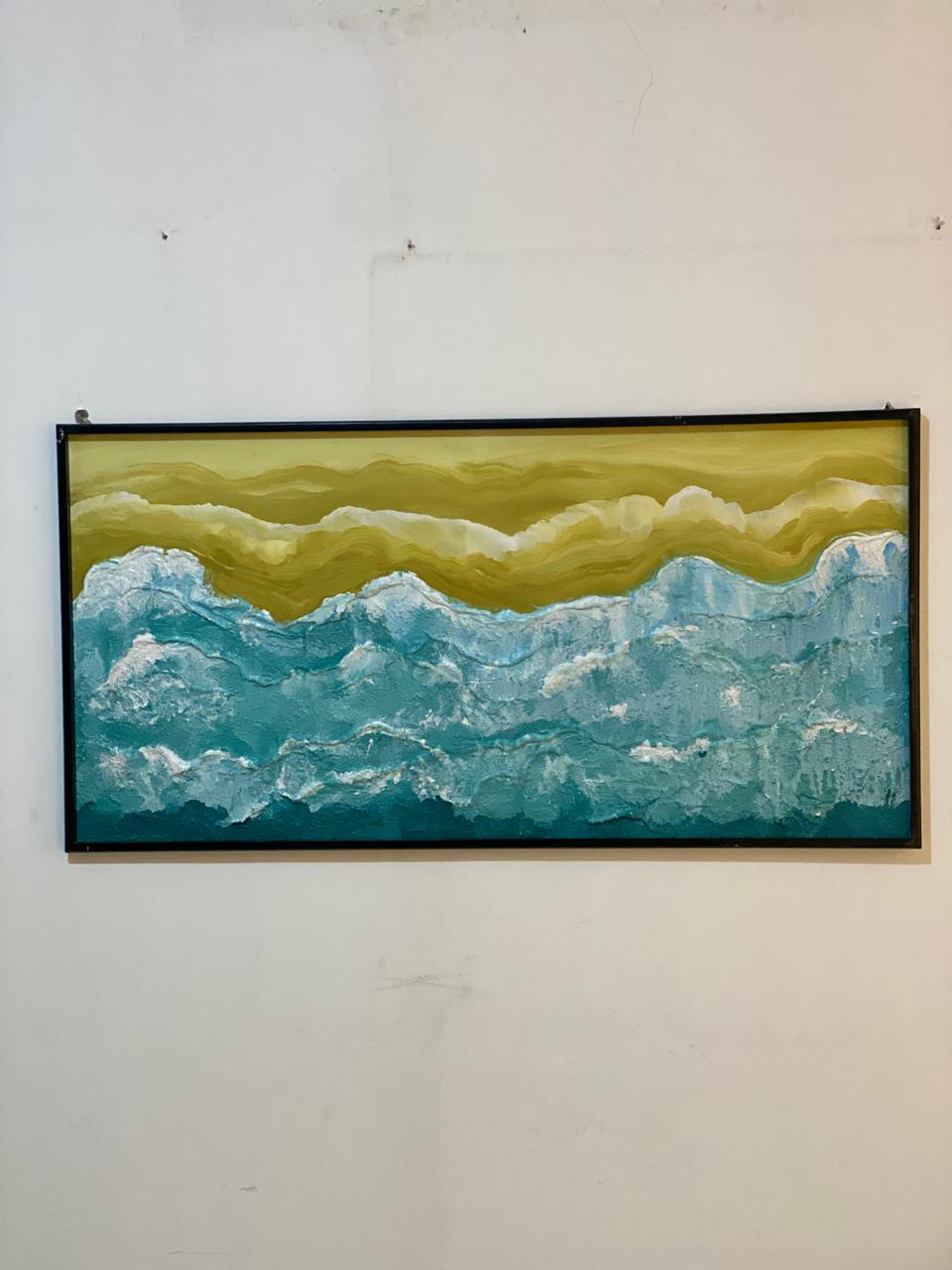 ج.ماكتشف جمال البحر بتفاصيله الهادئة مع لوحة بحرية بفريم أسود مرسومة يدويًا باستخدام المعجون والألوان البلاستيكية على لوح خشبي متين بمقاس 122x55 سم.
