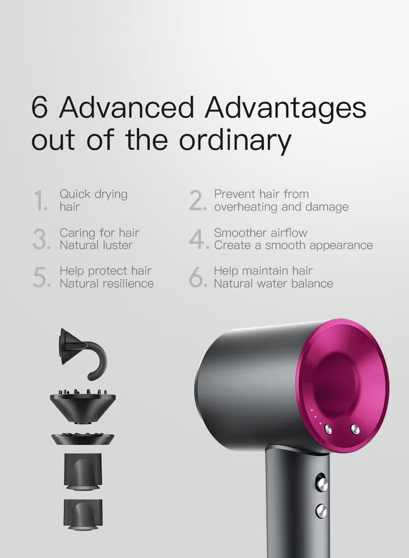 "عايزة نتيجة صالون في دقايق ومن غير سعر الدايسون؟ 😍 سشوار بديل الدايسون هيغيرلك روتين شعرك خالص!" 💎 المميزات 🚀 موتور فائق السرعة 110,000 RPM موتور Brushless قوي جدًا سرعة هوا توصل لـ 26 متر/ثانية أسرع 3 مرات من السشوار العادي ينشف شعرك في وقت قياسي ويوفر وقتك 💙 عناية بالأيونات السالبة (200 مليون أيون) بيحافظ على ترطيب الشعر يقلل الهيشان والتقصف يقفل مسام الشعرة ويخليها أنعم ولمعة أكتر نتيجة ناعمة كأنك عاملة بروفيشنال سيشوار 🧲 فوهة مغناطيس 360° بتركب بسهولة وبتلف في أي اتجاه تصميم بطبقتين ضد السخونة خامات مقاومة للحرارة وآمنة جدًا في الاستخدام 🌡️ 21 وضع مختلف للحرارة والسرعة تقدري تختاري بين 21 تركيبة لمبة حمراء = درجة الحرارة لمبة زرقاء = سرعة الهوا تحكم ذكي وسهل بعينك 🔇 هادي جدًا (أقل من 50 ديسيبل) صوت منخفض جدًا أثناء التشغيل تقدري تستخدميه في أي وقت من غير إزعاج 🎁 هدية مثالية مناسب كهدية لعيد الحب هدية راقية للأم أو الأخت أو أي حد بتحبيه سرعة الموتور: 110,000 لفة/الدقيقة سرعة الهواء: 26 م/ث الأيونات السالبة: 200 مليون مستوى الضوضاء: أقل من 50 ديسيبل عدد أوضاع الحرارة والسرعة: 21 وضع الفوهة: مغناطيس 360° الاستخدام: تجفيف وتصفيف احترافي سريع ⚠️ إرشادات أمان مش لعبة للأطفال يُحفظ بعيد عن متناول الأطفال يُستخدم تحت إشراف للكبار فقط